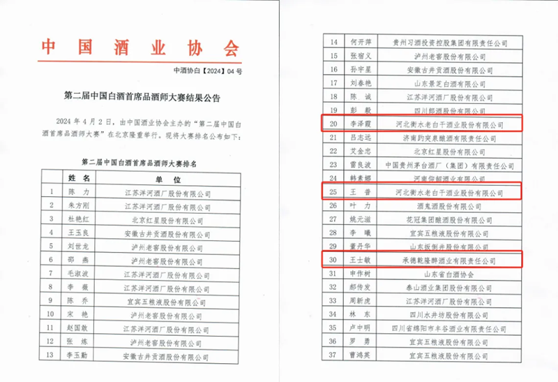 2024年4月2日,由中國(guó)酒業(yè)協(xié)會(huì)主辦的“第二屆中國(guó)白酒首席品酒師大賽”在北京隆重舉行。衡水老白干在原有李澤霞一位中國(guó)白酒首席品酒師的基礎(chǔ)上,又添王普、王士敏兩位中國(guó)白酒首席品酒師。
