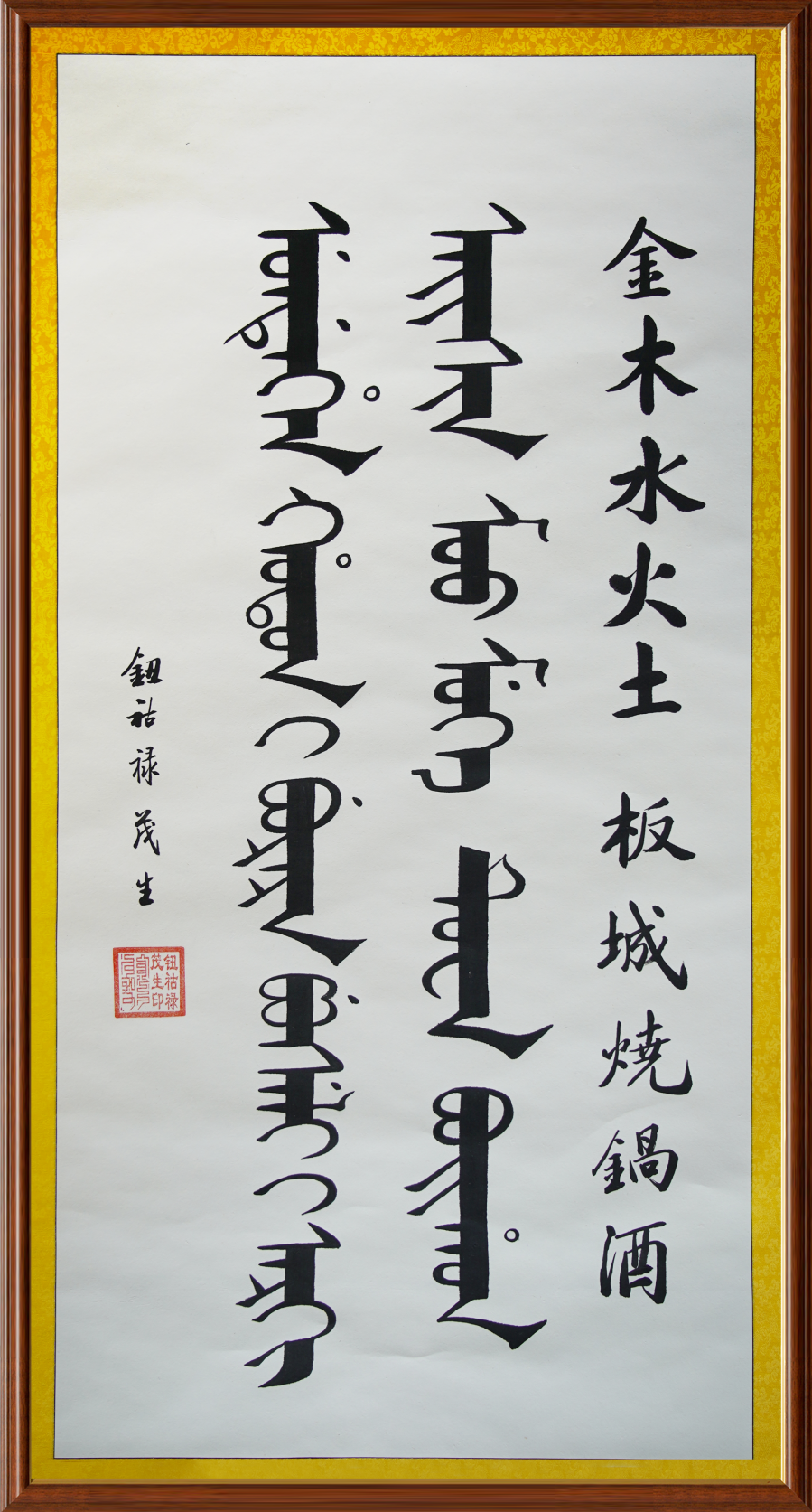 近日,板城酒業(yè)榮幸地收到了一幅珍貴的書法作品。這幅作品不僅體現了板城酒業(yè)深厚的文化淵源,更用滿漢兩種語言書寫了“金木水火土,板城燒鍋酒”的千古妙對,成為了板城燒鍋酒博物館館藏的一件獨特藝術瑰寶。