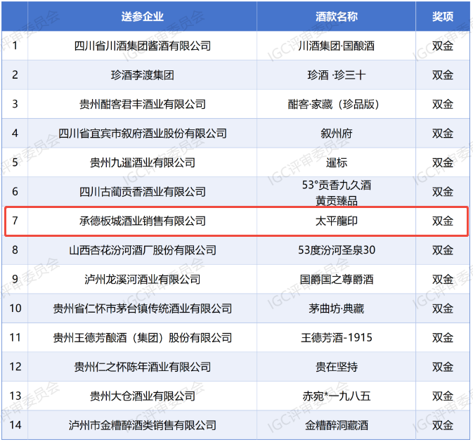 近日,2025年IGC國際烈酒(香港)大賽獲獎入圍第一批送檢合格名單公布,板城酒業(yè)——太平龍印,憑借卓越的品質(zhì)與柔順的口感,從百款參賽酒品中脫穎而出,一舉斬獲最高獎項(xiàng)——“雙金獎”!