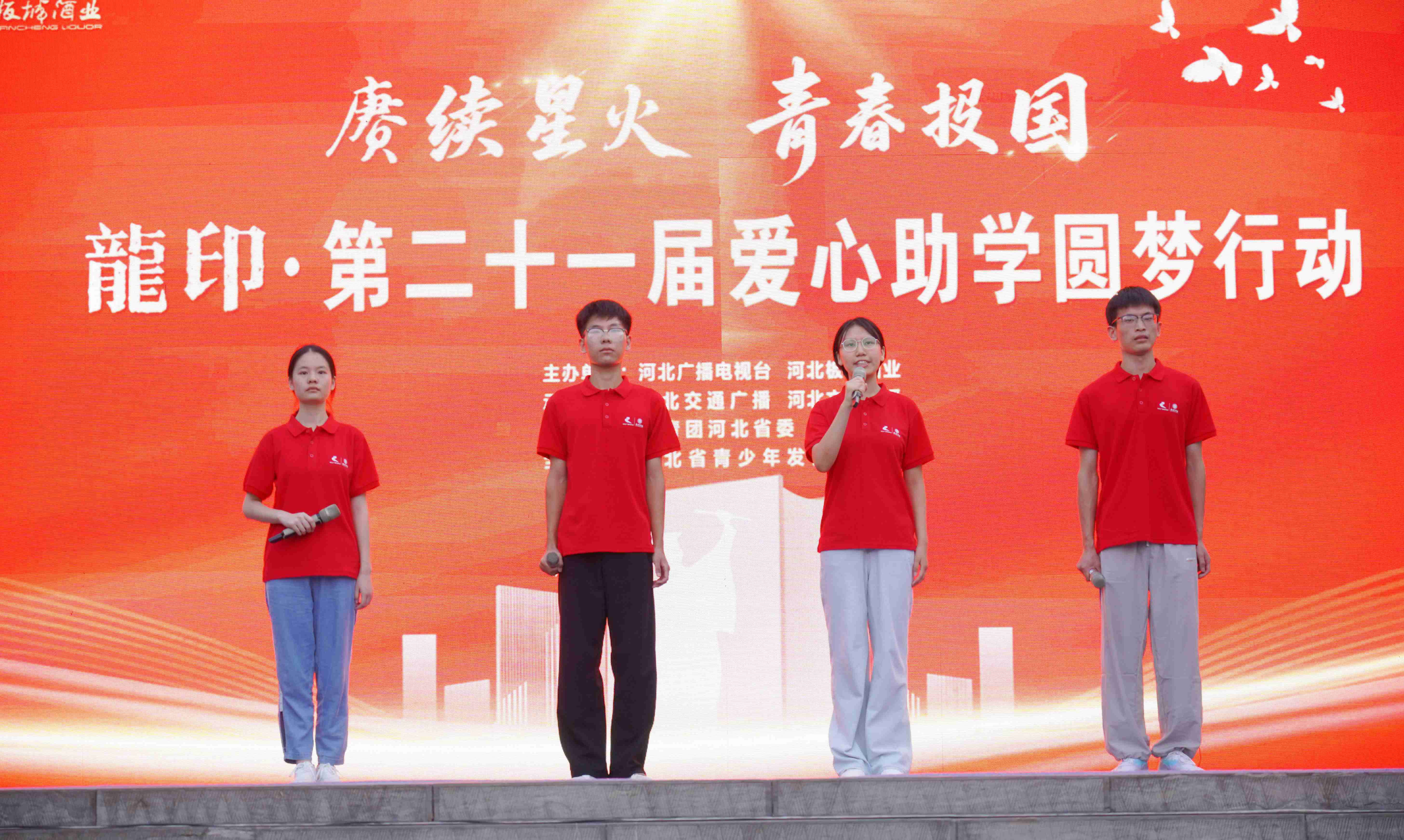 由河北廣播電視臺(tái)(集團(tuán))黨委副書記,總編輯、總經(jīng)理肖鈞,共青團(tuán)河北省委副書記龔磊,板城酒業(yè)黨委書記、總經(jīng)理張春生上臺(tái)給予學(xué)子們祝福與期望,并向應(yīng)屆學(xué)子代表授予象征著責(zé)任與夢(mèng)想的旗幟,寓意著廣大學(xué)子能夠立大志、明大德、成大才、擔(dān)大任,將愛心不斷傳承,肩負(fù)民族的希望。